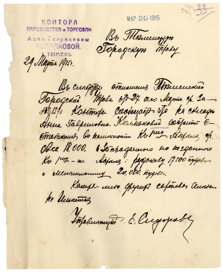 В 1894 году М. С. Кузнецов продал А. В. Колмакову за 25 000 рублей каменный двухэтажный склад с жилым помещением, с деревянными постройками и местом земли, «находящийся в 4 участке г. Тюмени, в Покровском приходе, земли к этому складу принадлежит: длиннику по улице и в задах по 24 сажени (51,84 м) и поперечнику с обеих сторон по 31 сажени (66,96 м), в межах оный состоит: с правой стороны с оградой Ильинской церкви, с левой с городским местом и с фронтона склада под горой – линия железной дороги».