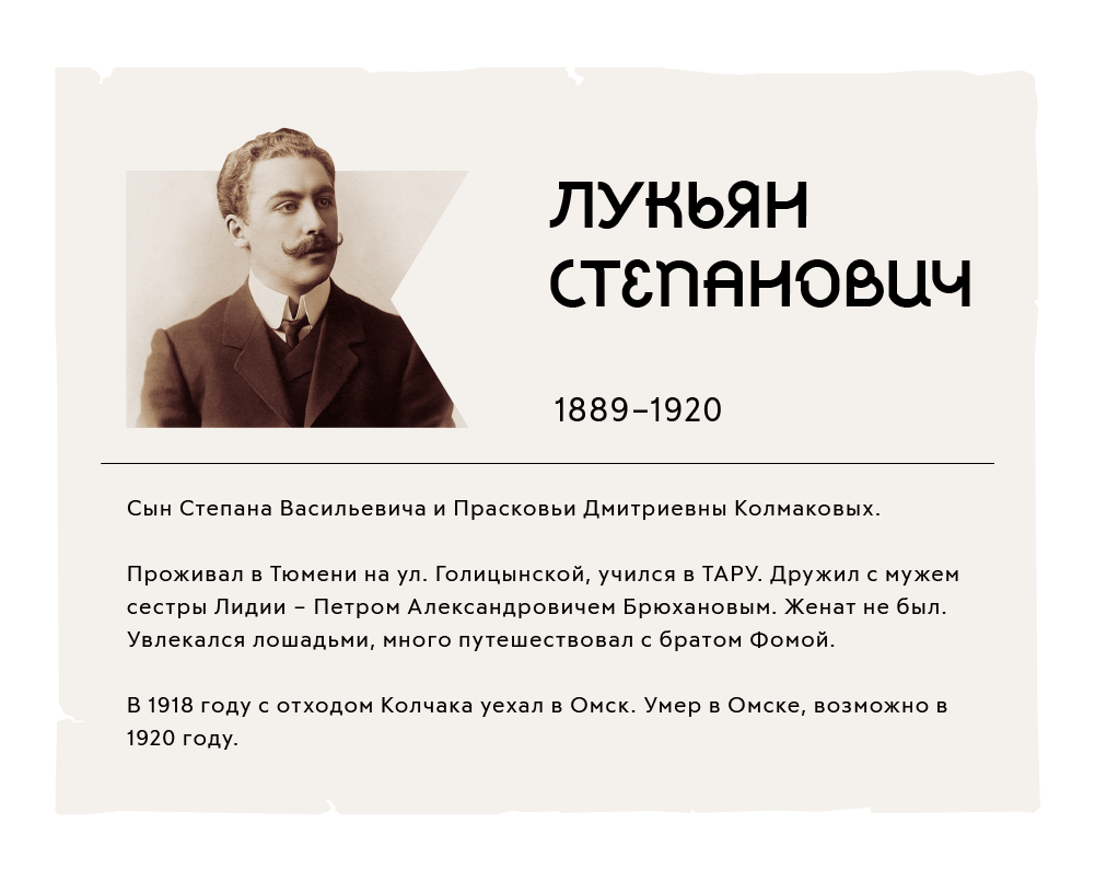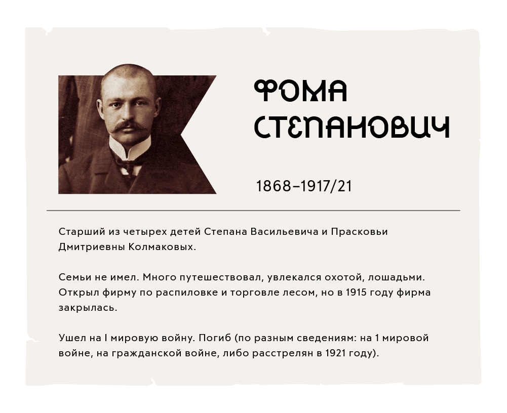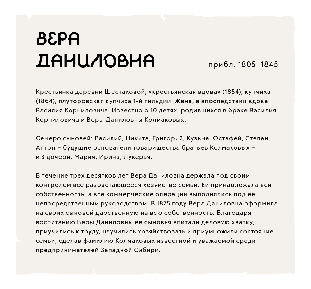 В 1844 году Василий Корнилович Колмаков приобрел землю на реке Ук Заводоуковской волости и основал заимку, что стало точкой отсчета становления и развития будущей «империи» Колмаковых. Есть сведения, что в 1845 году Василий Корнилович умер, поэтому всю империю Колмаковых пришлось поднимать его супруге. Она не была обучена грамоте, и на ее руках остались дети в возрасте от 1 года до 19 лет. Сыновья Колмаковых Василий, Никита, Григорий, Кузьма, Степан и Антон стали основателями товарищества братьев Колмаковых, которое впоследствии имело миллионные обороты от торговли товарами крупчаточного, мучного, пряничного, салотопенного, кожевенного, свечного, паточного и мыловаренного производства. Следующее поколение «Братьев Колмаковых» составляли Федот Григорьевич, Авксентий и Кирьяк Степановичи, помогал им Крискент Васильевич.