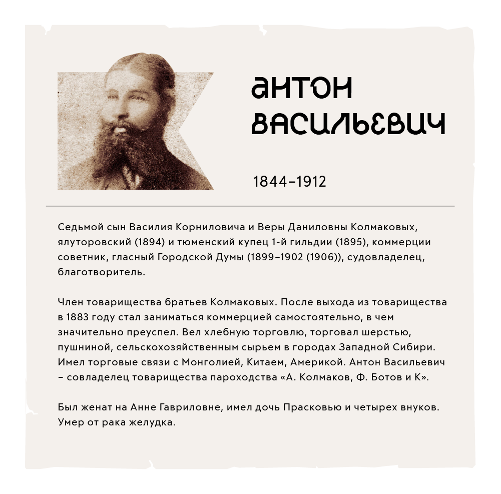 В 1883 году Антон Васильевич вышел из товарищества и стал вести дела самостоятельно. Коммерческие связи купцов Колмаковых протянулись по всей Западной Сибири до Монголии и Китая. Колмаковы имели даже собственные пароходы, и если в 1868 году на «Калмыковой заимке» находилось 3 двора с приписанными к ним 19 крестьянами, то через 30 лет на этой территории было уже 89 хозяйств, в которых проживало 445 человек.